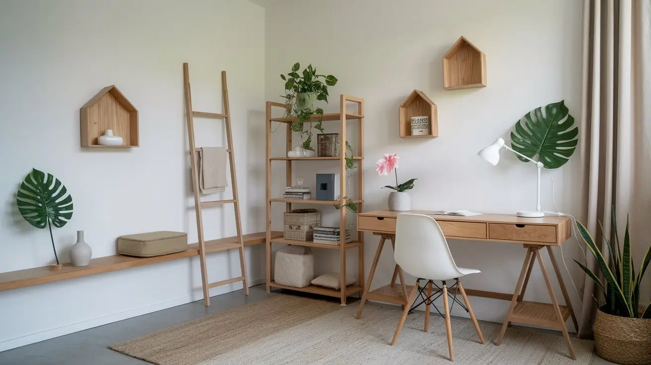 Combine rustic charm with minimalist elegance using a Wooden Ladder Shelf. This space-saving storage solution adds warmth and texture to your home office while maintaining a sleek, airy feel.