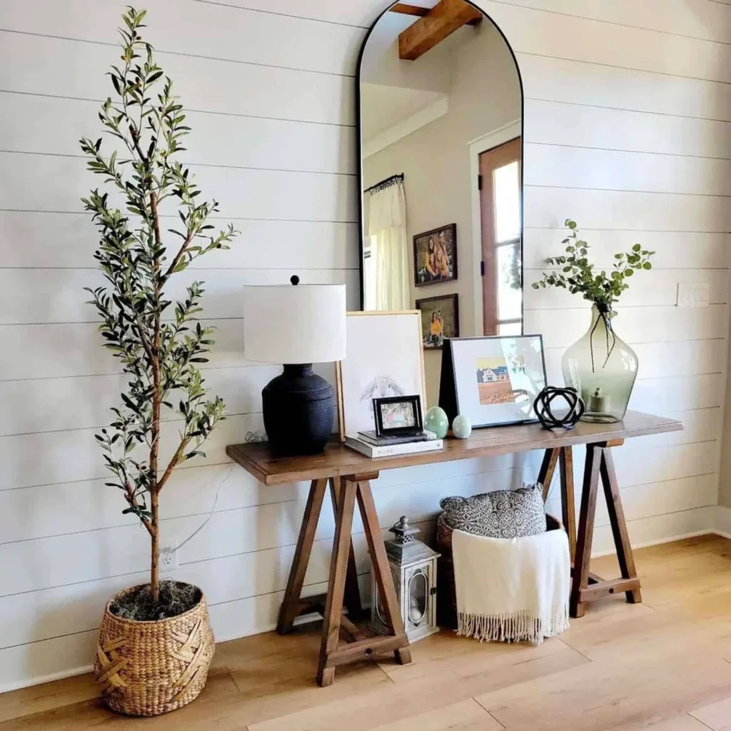 Bring the outdoors in by placing a small potted tree, like a lemon or olive tree, near your entry table. The lush greenery adds height, texture, and a fresh, organic vibe to your spring setup.
