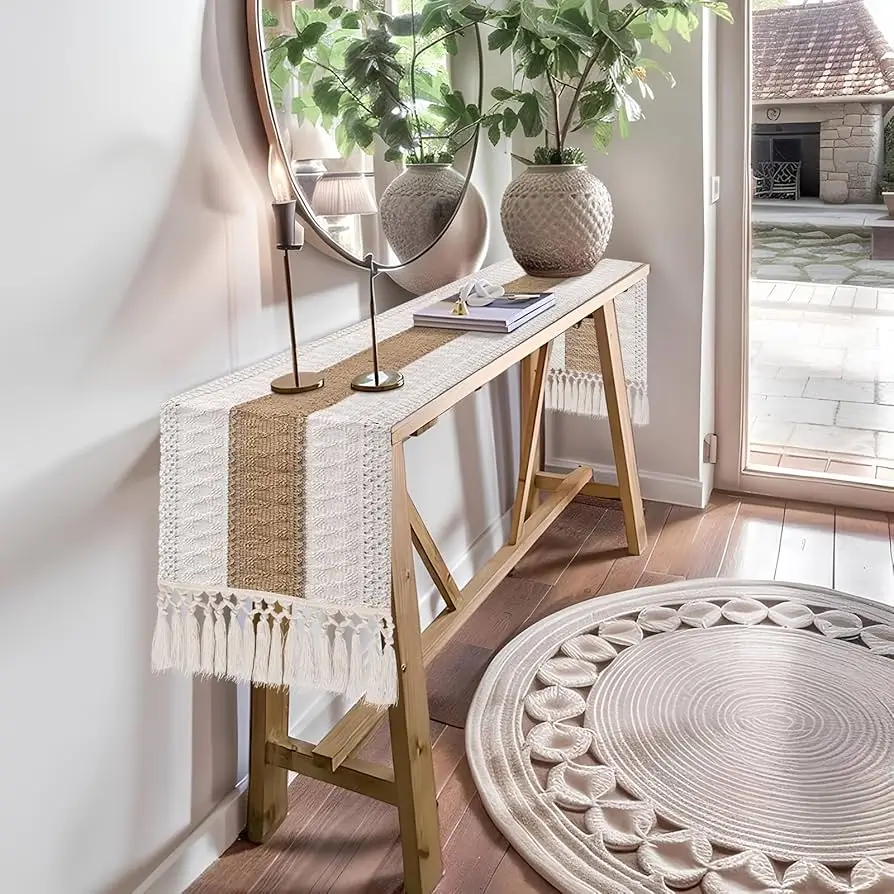 Add softness and color to your entry table with a lightweight spring-themed runner. Look for designs in pastel hues or with floral, checkered, or botanical patterns to enhance the seasonal aesthetic.