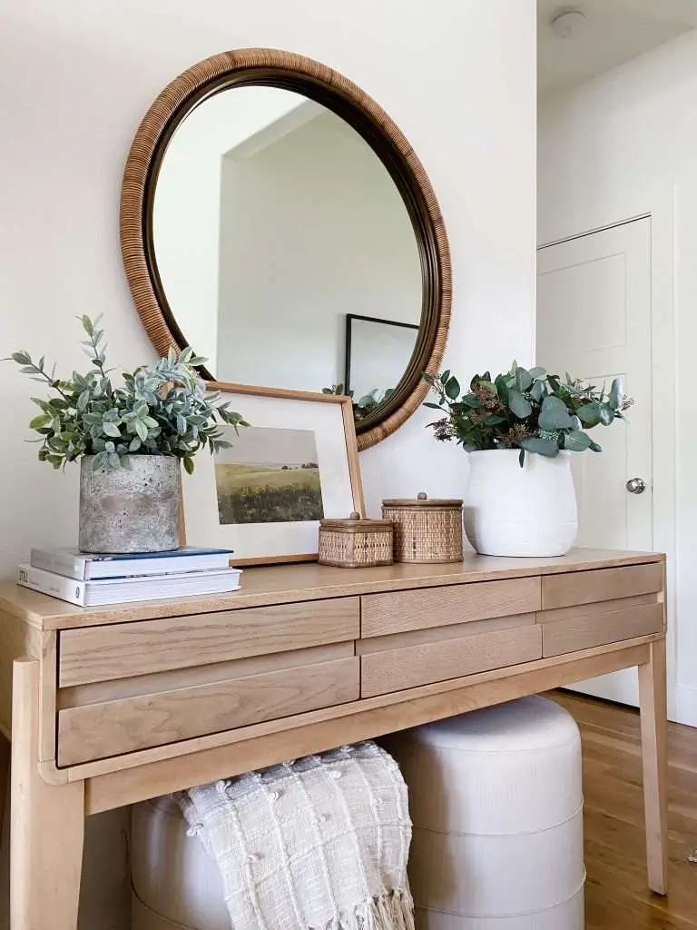 A statement mirror not only makes your entryway feel larger and brighter but also enhances your spring décor. Choose a mirror with a frame in rattan, pastel hues, or metallic tones to match the seasonal vibe.