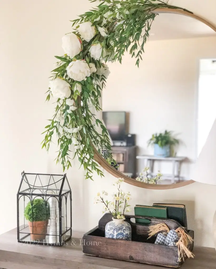 A floral or greenery garland adds a whimsical, romantic touch to your entry table. Drape it along the edge of the table or around a mirror for an effortlessly spring-like effect.